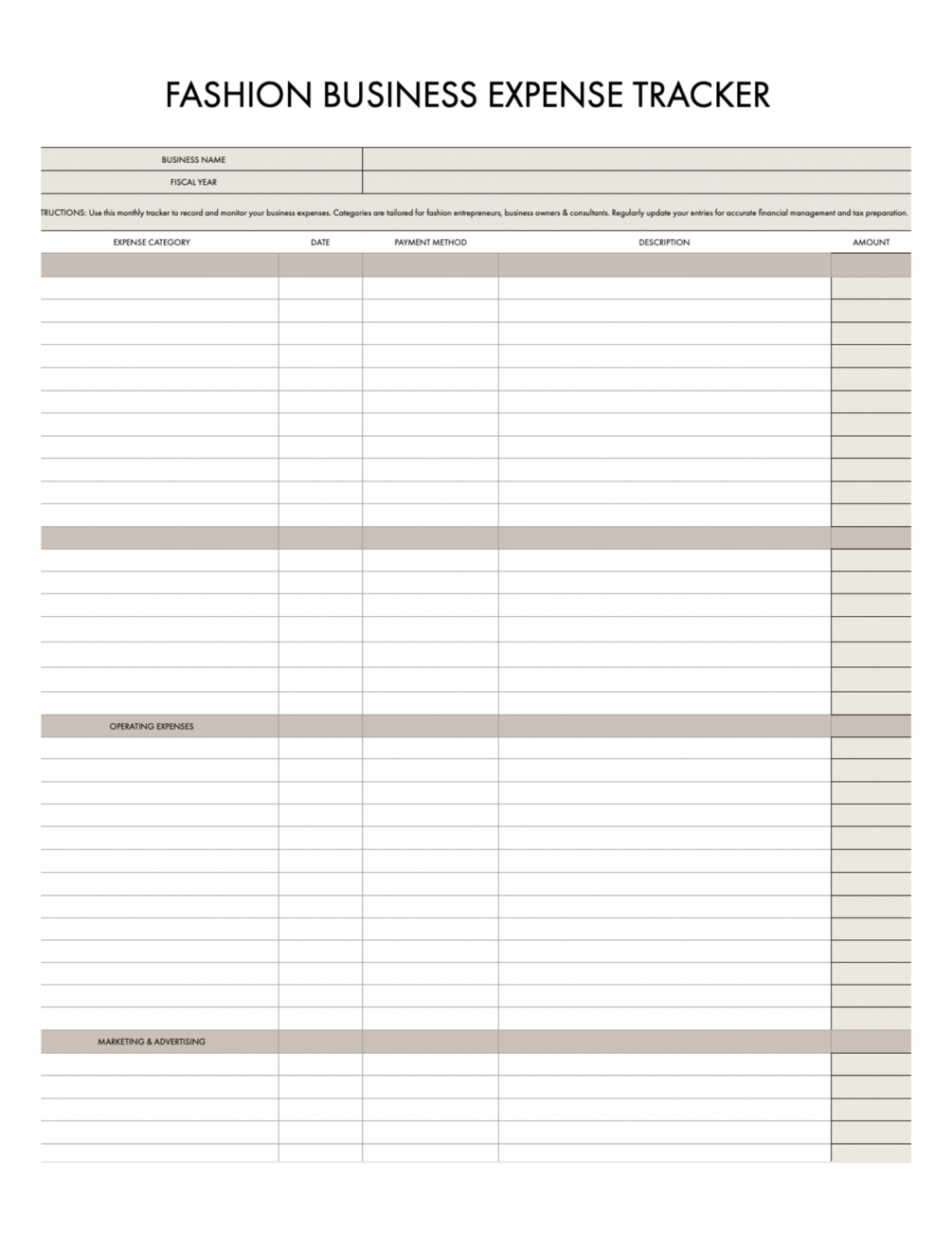 • A customizable expense tracker for fashion business owners • Built-in formulas that auto-calculate totals and categorize expenses • A user-friendly tool for tracking everything from supplies to business travel • A PDF document with clear sections for easy input and tracking • A reliable resource designed to help you manage and organize your business finances